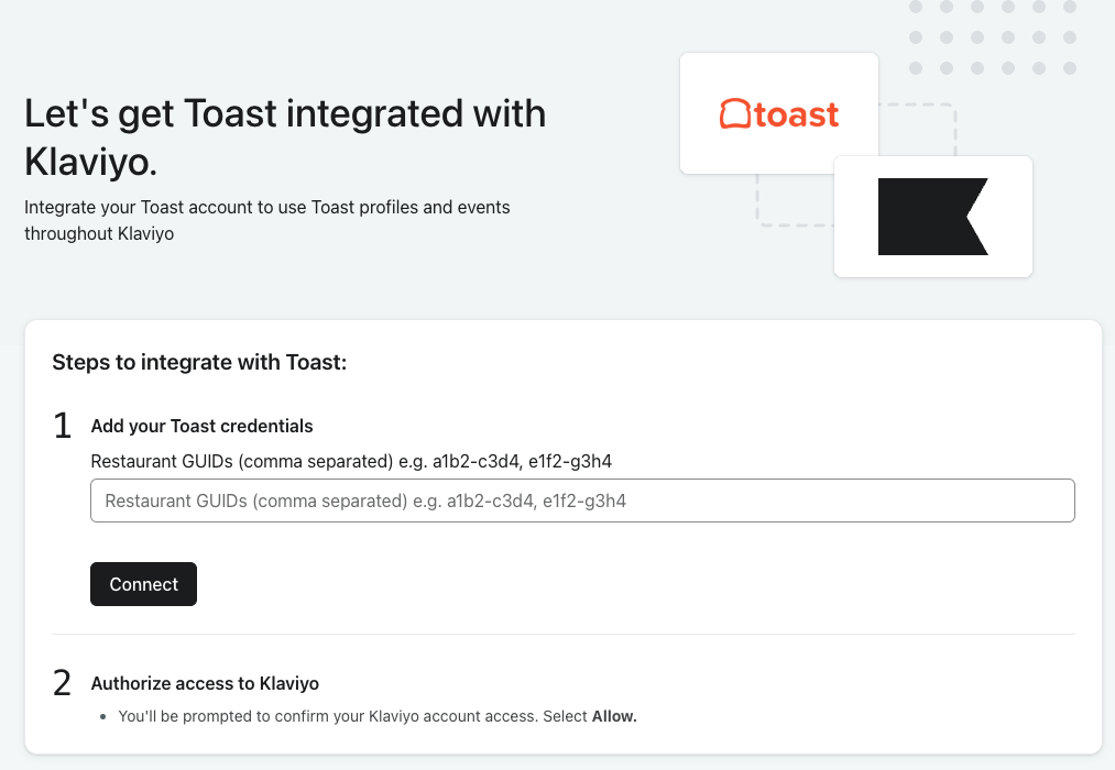 Avant d'entreprendre des actions dans Klaviyo, ajoutez d'abord l'intégration dans Toast.