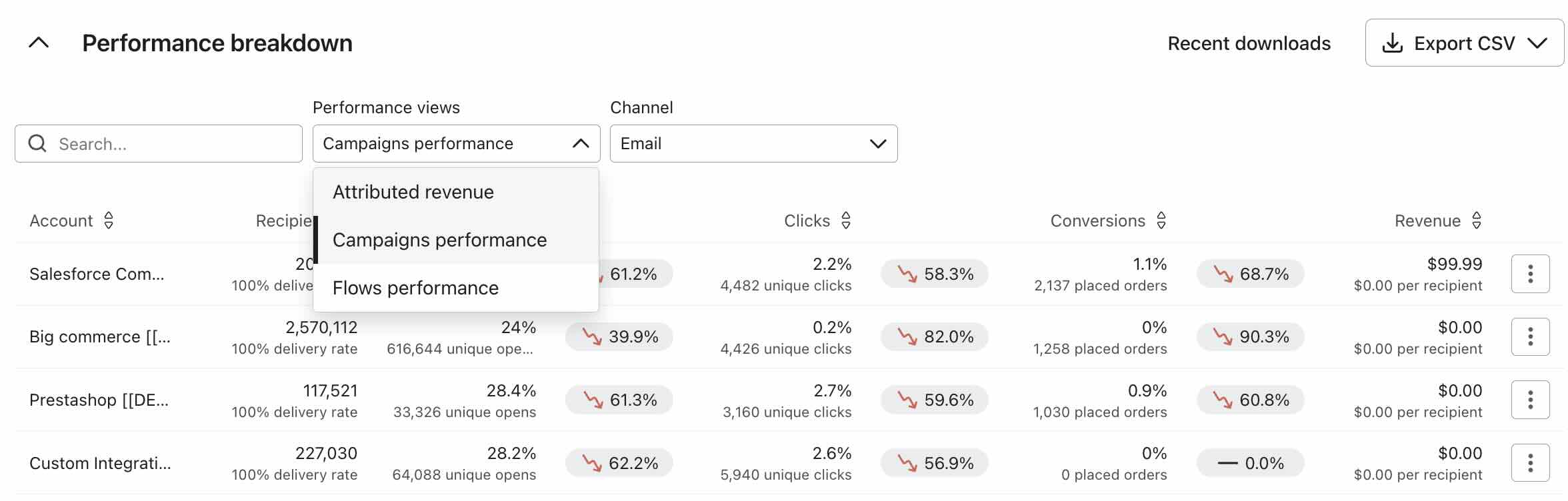 Examinez et comparez la manière dont des campagnes ou des flux spécifiques contribuent au succès de chaque compte, et comparez les performances globales sans avoir à vous connecter à chaque compte.