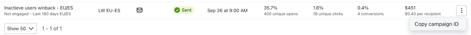 Vous pouvez également copier l'identifiant d'un compte particulier dans votre presse-papiers si vous souhaitez examiner les performances plus en détail. Cliquez sur le menu à trois points situé à côté d'une campagne ou d'un flux spécifique.