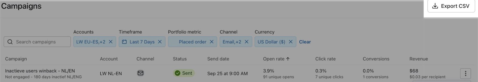 Examinez et comparez vos comptes et leurs performances en matière de campagne ou de flux en exportant les données brutes. Cliquez sur Exporter CSV pour télécharger ces informations. Gardez à l'esprit que votre exportation reflétera les options de tableau que vous avez sélectionnées.