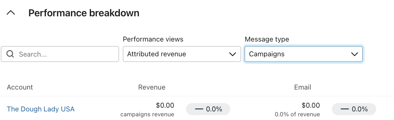 Sous le graphique, vous pouvez voir la section Ventilation des performances . Vous y trouverez un tableau contenant plus de détails sur les performances de chaque compte en matière de campagne et de flux.