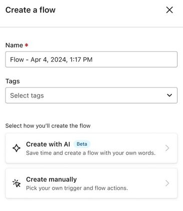 - Saisissez une description du flux que vous souhaitez créer. Si vous ne savez pas exactement comment structurer le flux, saisissez le type de flux que vous souhaitez créer (par exemple, flux de panier abandonné) ou commencez par une structure simple que vous pourrez développer par la suite. Vous pouvez inclure :