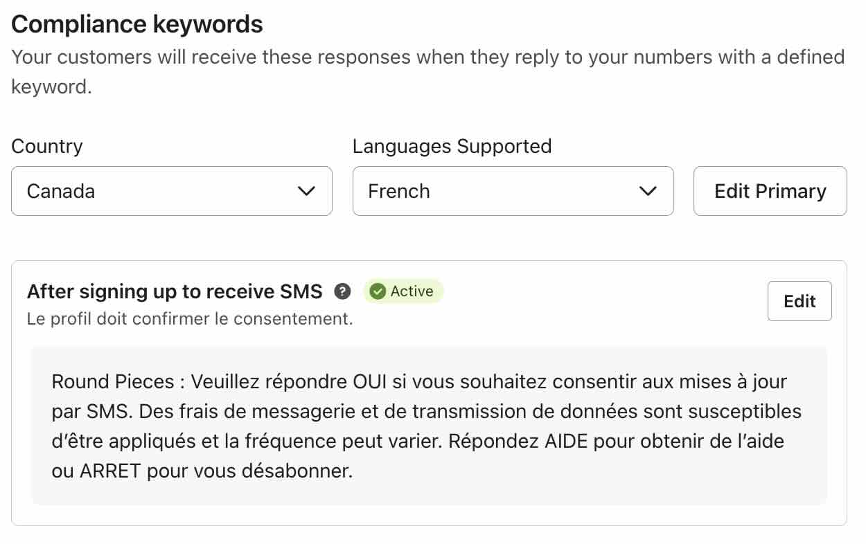 Vous pouvez modifier certains paramètres pour les mots-clés de conformité SMS, tels que
