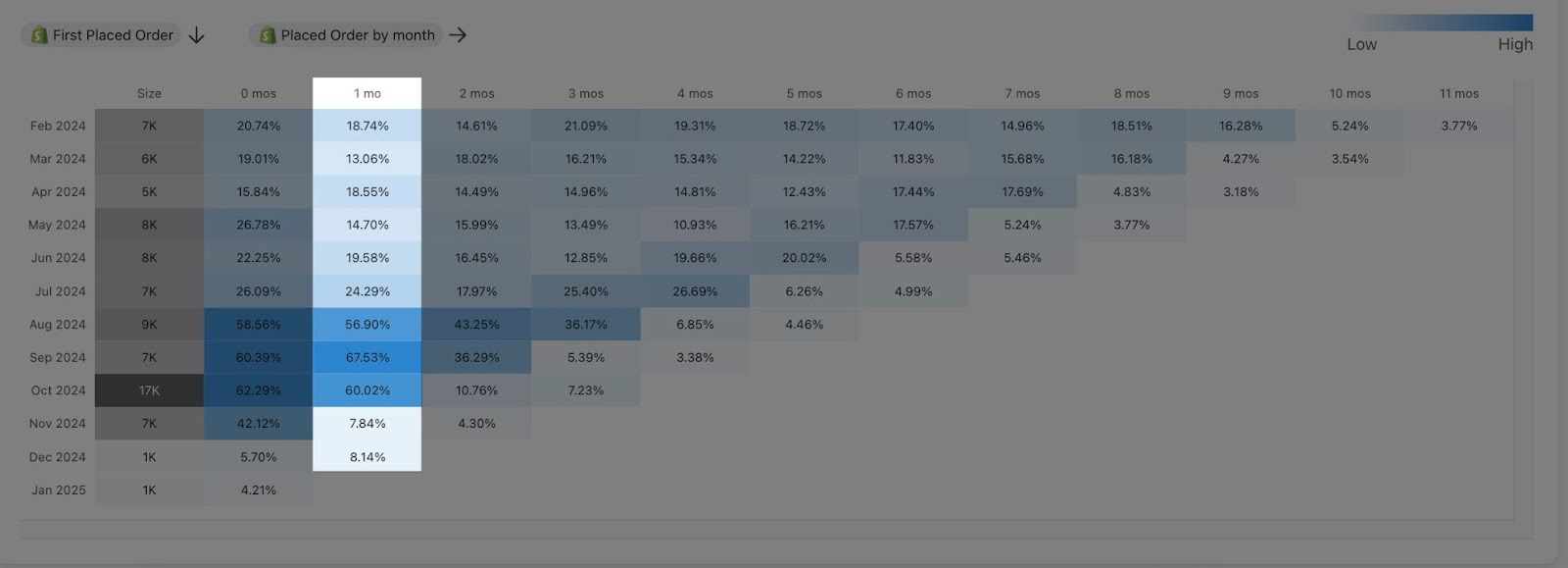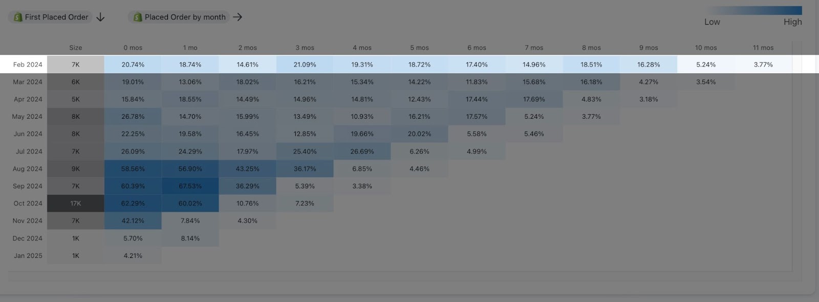 Dans l'exemple, la première colonne du rapport de cohorte (c.-à-d. Taille) indique le nombre total de clients ayant effectué un premier achat en 2024. Chaque colonne suivante indique le pourcentage de la cohorte initiale qui a effectué des achats supplémentaires au fil du temps pour chaque mois civil. En lisant le rapport horizontalement, vous découvrirez insights le taux de réachat au fil du temps.