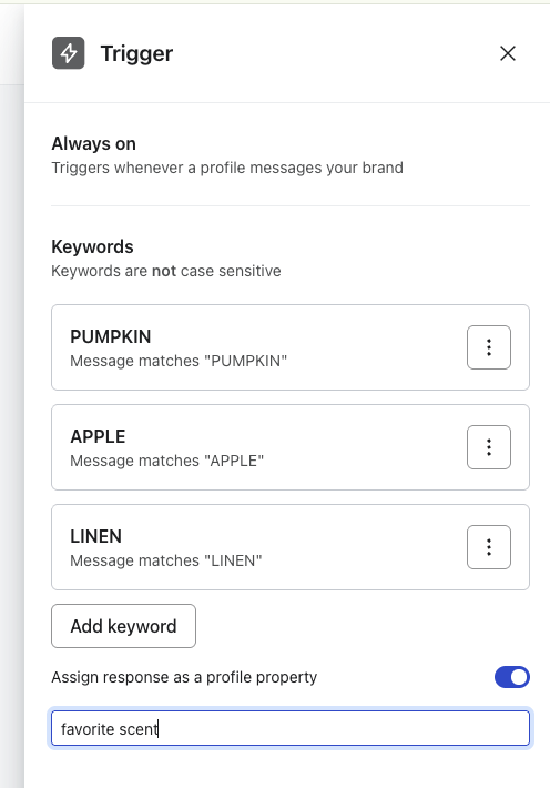 - Facultatif, mais fortement recommandé : pour définir des propriétés de profil en fonction du déclencheur par mot-clé, faites bouton bascule sur l’option Attribuer les réponses en tant que propriété de profil.