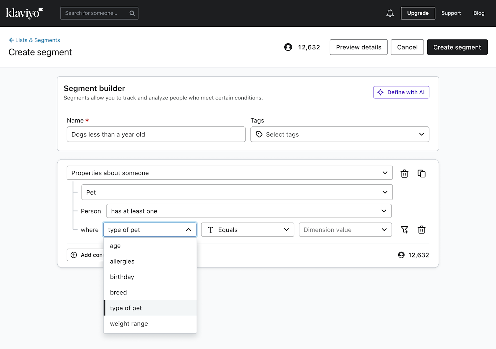 Supposons que vous ayez un objet Pet qui contient des données sur les animaux de vos clients. Vous pouvez créer des segments comme :
