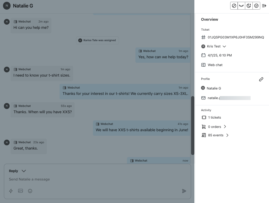 Notez que la section Vue d’ensemble comprend également d’autres informations sur le ticket (par exemple, le numéro du ticket, la date de création, le canal (SMS ou chat web), le nombre total de tickets associés à ce client, etc.), ce qui fournit un contexte supplémentaire à votre équipe d’assistance. Pour plus d’informations sur le fonctionnement des tickets dans le service d’assistance, consultez notre guide sur la navigation dans l’onglet Boîte de réception.