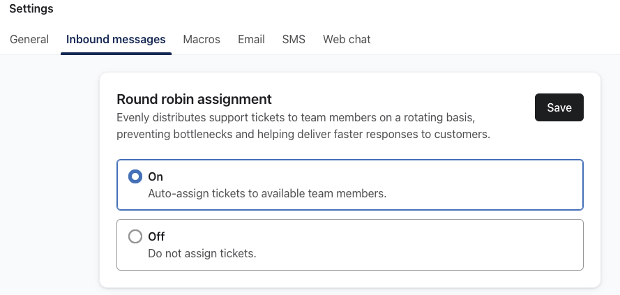 - Lorsque l'assignation Round robin est activée, Klaviyo assigne automatiquement les nouveaux tickets d'assistance aux agents disponibles ("Online") dans un ordre rotatif. C'est une excellente option si vous disposez d'une équipe d'assistance dédiée avec plusieurs utilisateurs qui contrôlent les tickets.