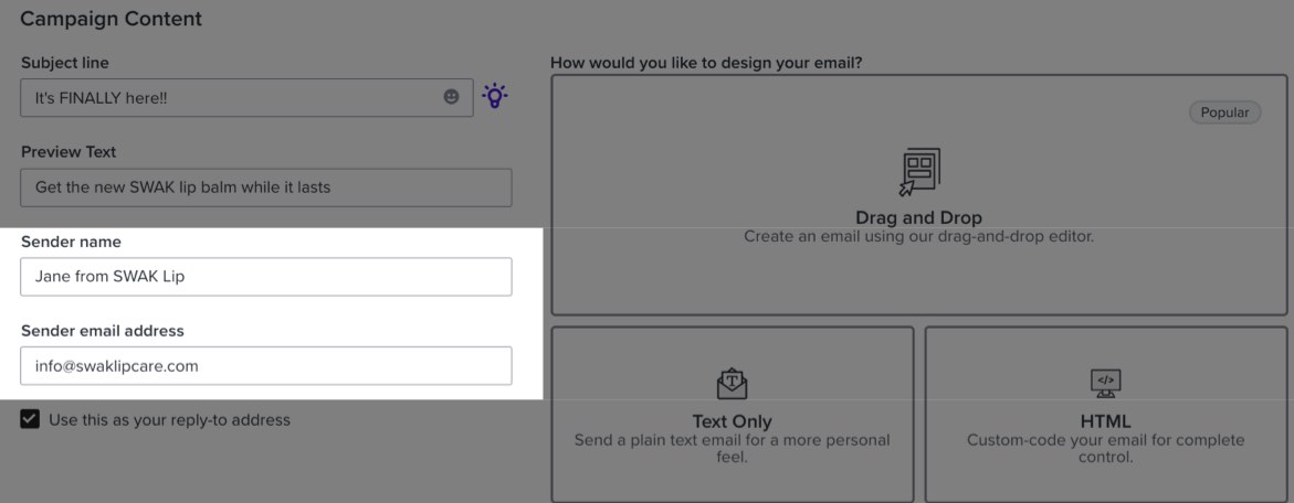 Si vous modifiez l’adresse e-mail d’expédition pour un seul e-mail dans un flux ou une campagne, elle sera utilisée par défaut comme adresse de réponse. Pour mettre à jour l’adresse e-mail d’expédition sans qu’elle soit définie comme adresse de réponse, décochez la case Utiliser cette adresse e-mail comme adresse de réponse pour un e-mail de campagne ou de flux.