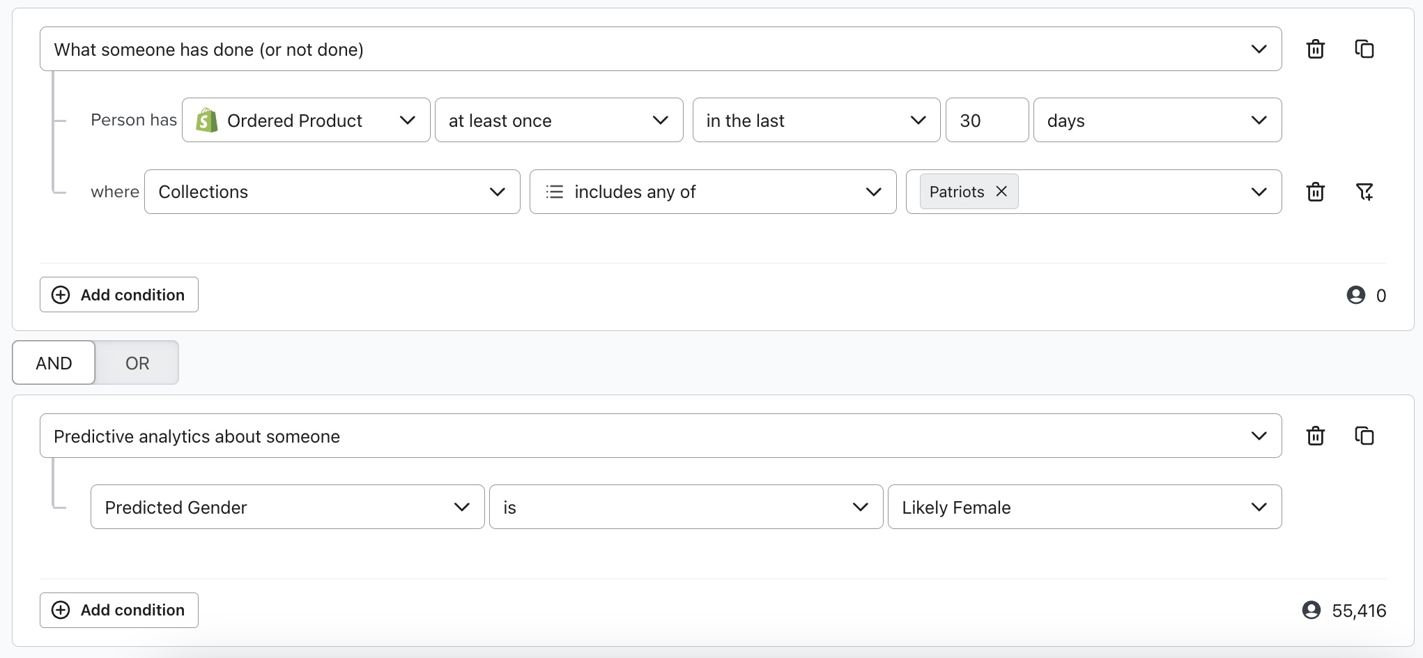 Vous pouvez utiliser de nombreuses autres caractéristiques de vos clients pour affiner vos segments. N’hésitez donc pas à expérimenter différentes conditions qui vous intéressent ou qui sont pertinentes dans le cadre de votre boutique.