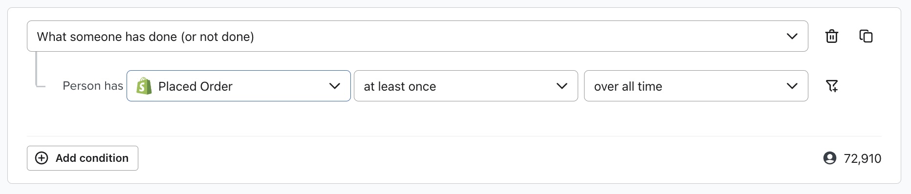 Pour créer ce segment, la seule condition nécessaire est que les contacts doivent avoir passé au moins une commande, comme indiqué ci-dessous.