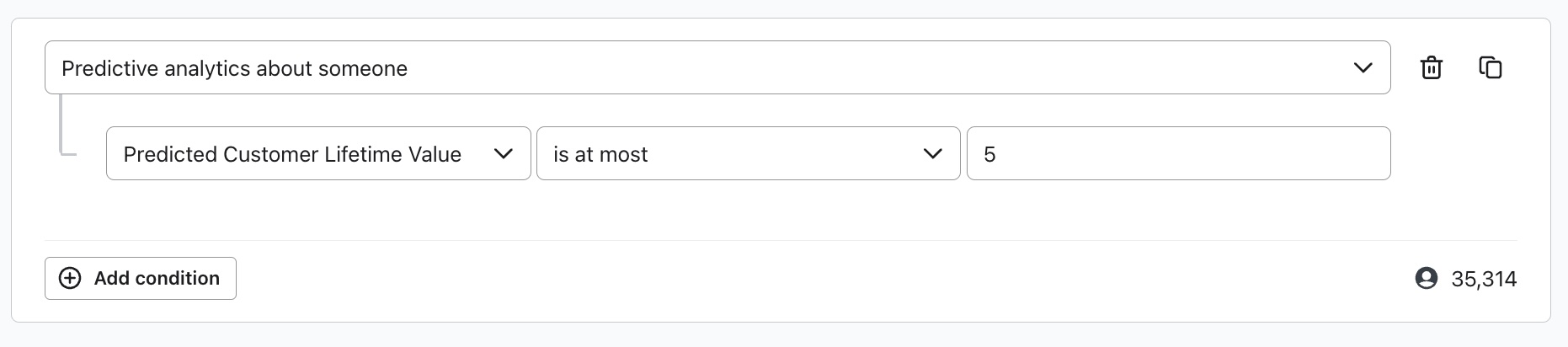 Vous pouvez également utiliser l’indicateur de valeur vie client (CLV) prévue proposé par Klaviyo pour identifier les personnes qui sont peu susceptibles d’acheter à nouveau, comme indiqué dans notre article sur la segmentation en fonction de la CLV.