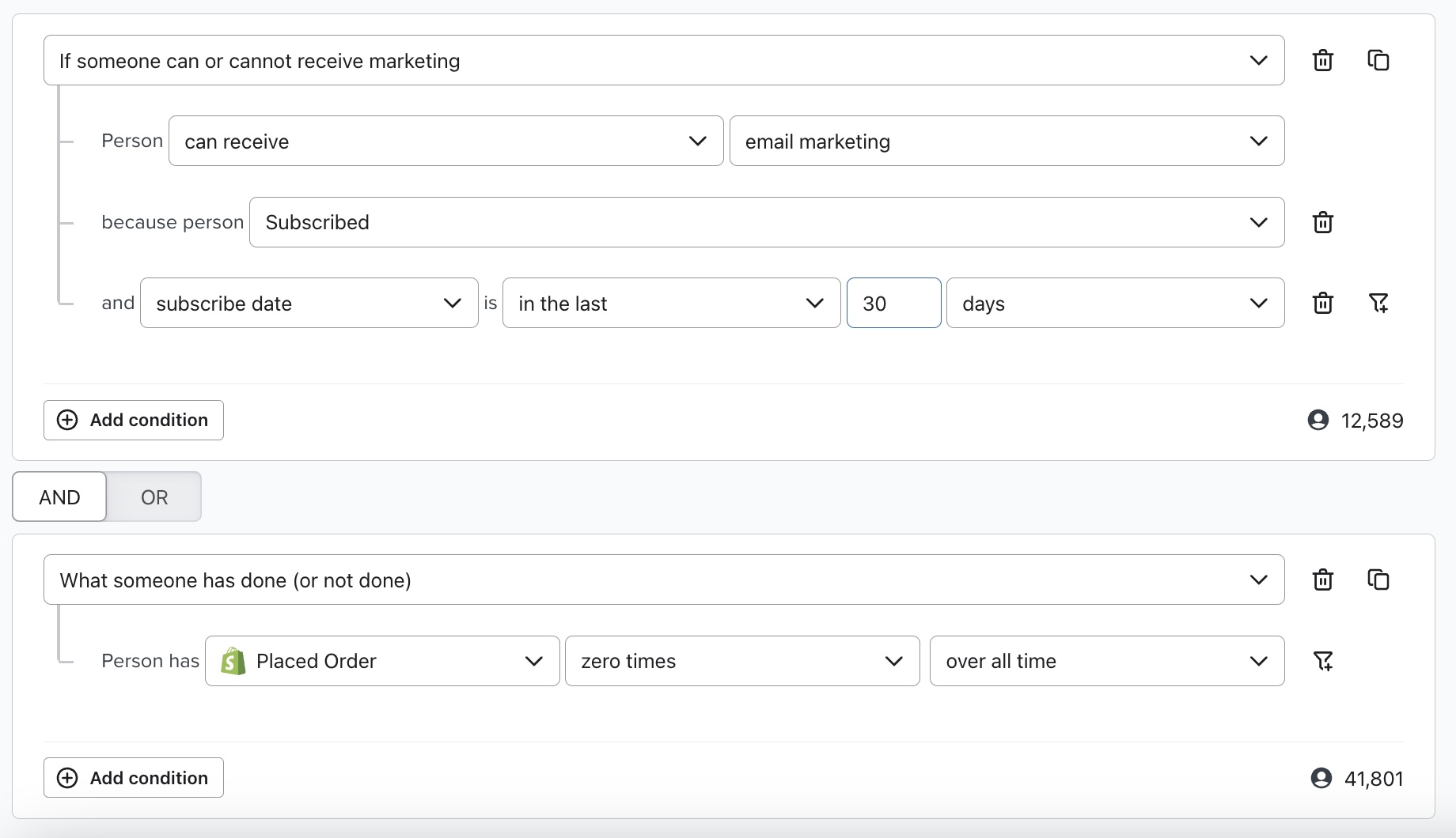 Pour créer ce segment, vous pouvez utiliser les conditions suivantes, en adaptant les valeurs aux besoins de votre marque :