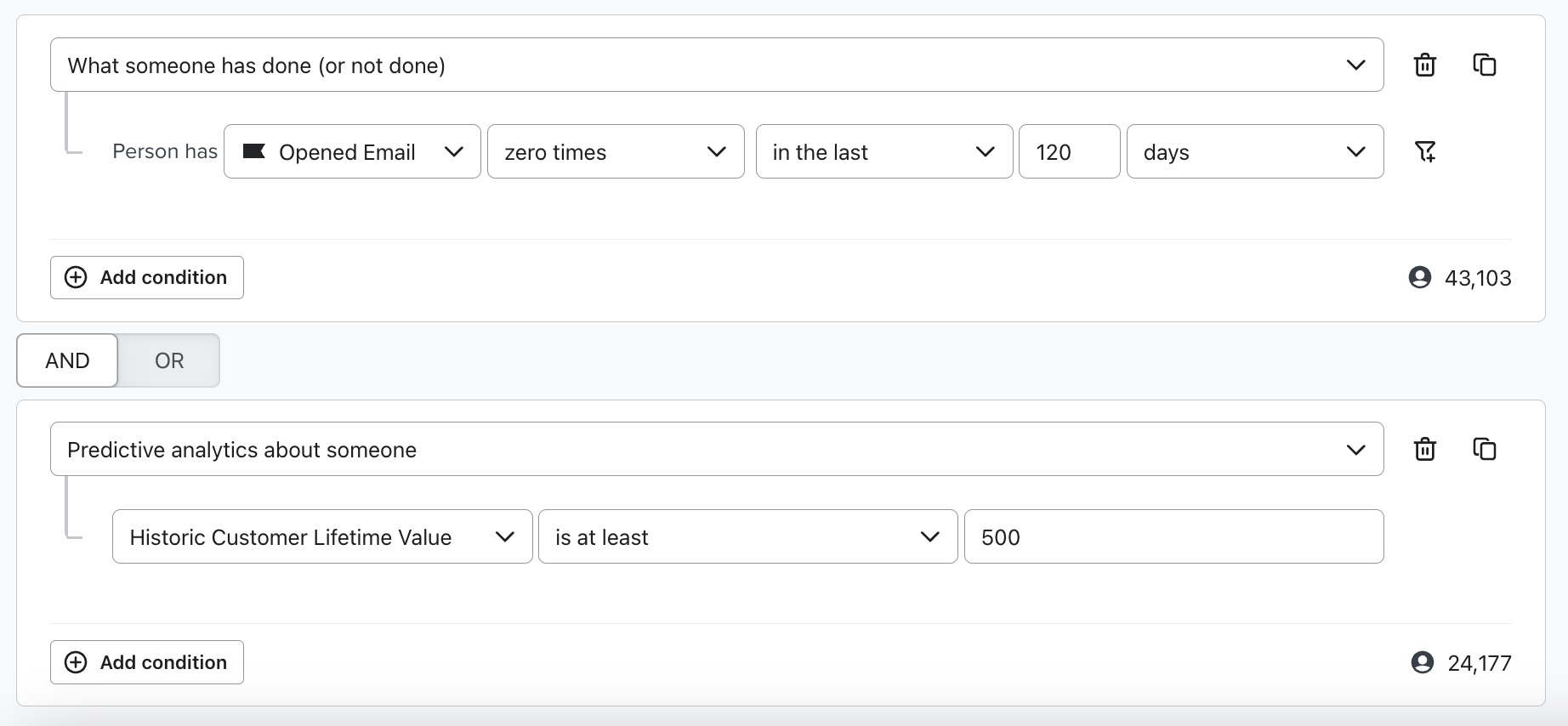 Pour les segments qui ont recours à notre fonctionnalité d’analyse prédictive, vous devez également avoir au moins 180 jours d’historique de commandes, avoir reçu des commandes au cours des 30 derniers jours et disposer d’une liste d’au moins 500 clients qui ont passé commande à un moment ou à un autre (ces trois conditions correspondent à l’indicateur Placed Order). Dans le cas contraire, Klaviyo n’est pas en mesure de faire des prévisions suffisamment précises.
