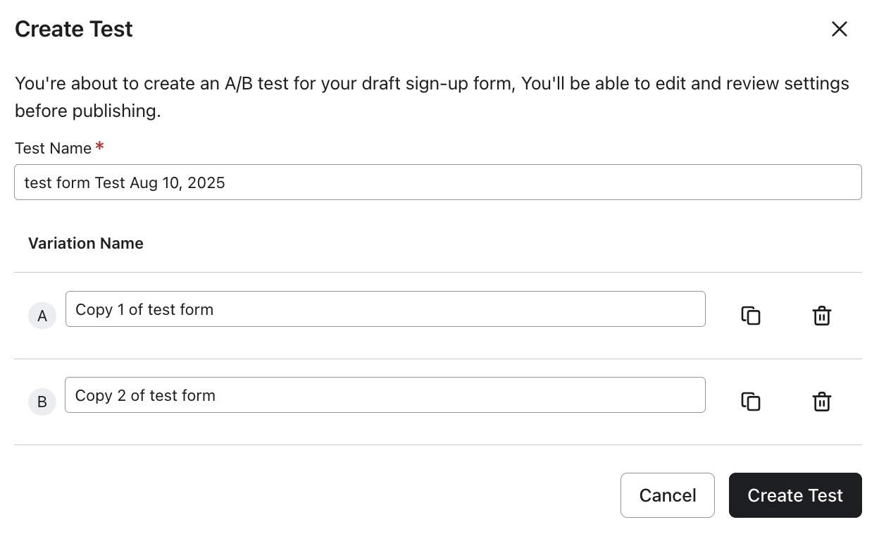 - Une fois que vous avez nommé votre test A/B, donnez des noms différents aux variantes de votre formulaire d’inscription afin de pouvoir les distinguer.