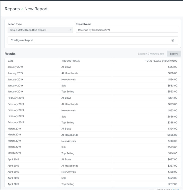 Tous les rapports précédemment exécutés seront automatiquement enregistrés dans votre page d'analyse personnalisée. Il n'est pas possible de sauvegarder un rapport partiellement configuré, mais chaque rapport sera automatiquement sauvegardé après sa première exécution. Lorsque vous naviguez dans un rapport existant, l'heure à laquelle le rapport a été exécuté pour la dernière fois apparaît au-dessus de vos résultats, ainsi qu'un bouton Exporter.