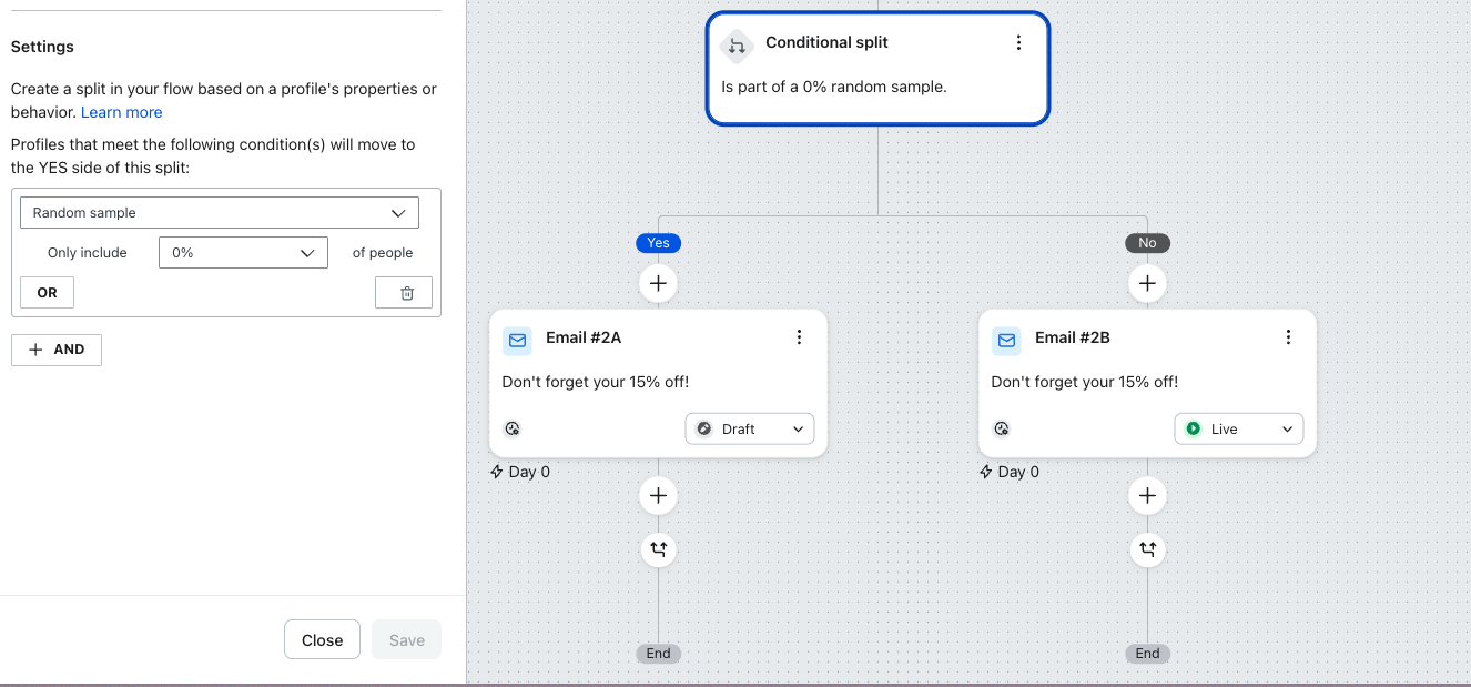 - Lors de la configuration de la division, sélectionnez l'échantillon aléatoire comme condition. Ici, vous serez invité à sélectionner le pourcentage de votre public qui suivra la voie du OUI, que vous pouvez considérer comme le contrôle.