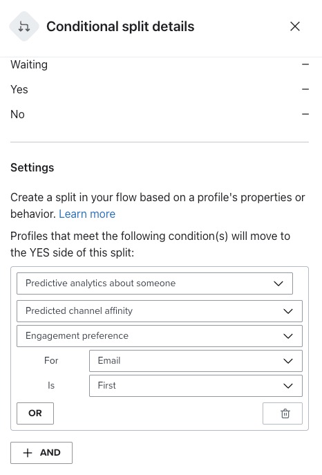 Vous pouvez également utiliser les propriétés d'affinité des canaux dans le fractionnement conditionnel pour envoyer les profils sur des chemins différents dans un flux en fonction de leurs préférences en matière de canaux.