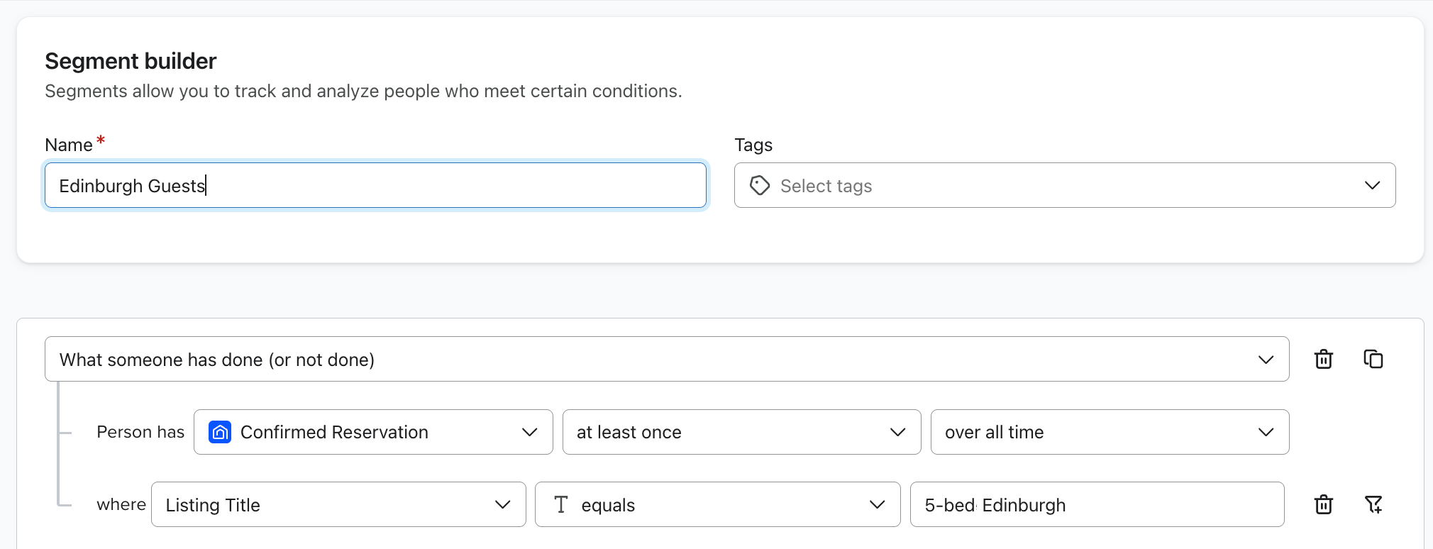 Vous pouvez utiliser les indicateurs Guesty pour segmenter les invités. À l’aide d’indicateurs, par exemple, vous pouvez créer un segment de clients qui ont confirmé une réservation à un endroit spécifique :