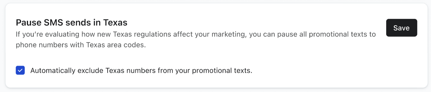 Pendant que vous finalisez votre inscription au Texas, vous pouvez désormais suspendre tous les SMS promotionnels envoyés à des numéros de téléphone associés aux indicatifs régionaux du Texas, ce qui vous permet de mieux contrôler vos envois SMS et votre conformité.