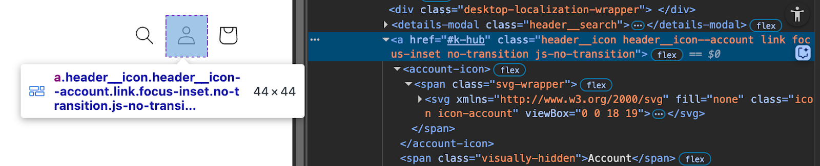 Pour que le Customer Hub de Klaviyo s’ouvre en cliquant sur l’icône du compte dans l’en-tête de votre boutique, vous devez déjà disposer d’un tag a qui fait référence à un lien avec /account (auquel cas nous le remplacerons automatiquement). Vous pouvez également définir manuellement le lien de l'icône pour pointer vers #k-hub afin d'ouvrir le tiroir.