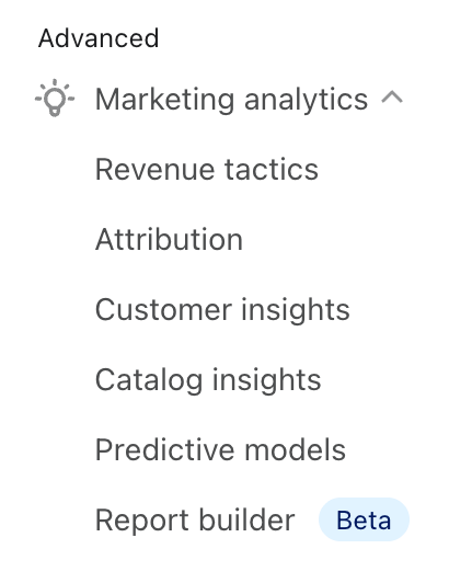 - Accédez à Advanced → Marketing analyses → Générateur de rapports (version bêta).