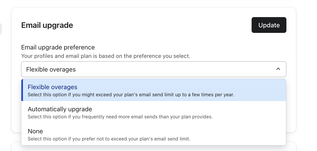 Vous pouvez choisir de passer automatiquement à un abonnement Profils + e-mails inférieur sur la page des préférences de facturation de Klaviyo.