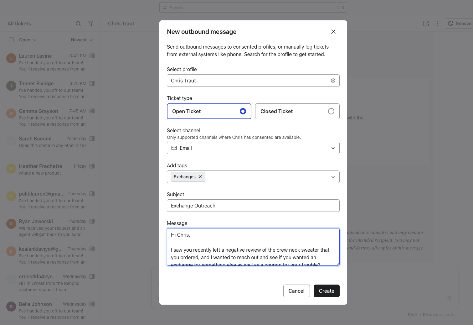 - Enregistrement d’un ticket clôturé : documenter une conversation qui s’est produite en dehors de Klaviyo (par exemple, un appel téléphonique ou une visite en magasin).