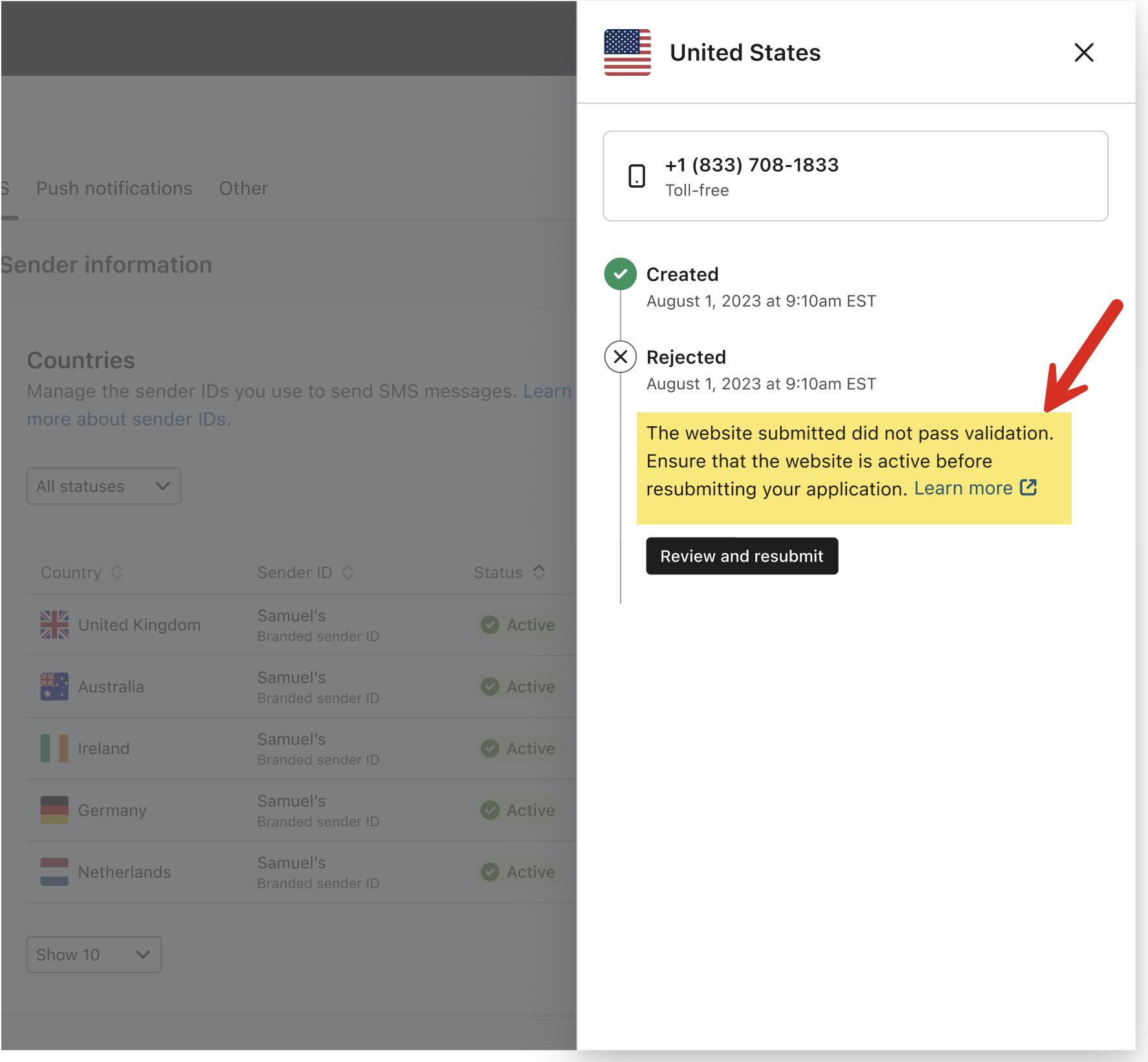 Si le numéro est rejeté, vous ne pourrez pas envoyer de SMS ou de MMS à partir de ce numéro. Les opérateurs de téléphonie mobile ne transmettront pas les messages pour un numéro gratuit refusé.