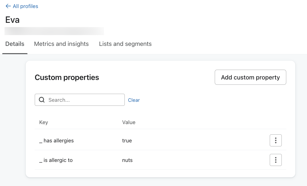 Può anche segmentare i clienti in base alle informazioni che hanno fornito tramite un modulo Typeform, e quindi inviare a un gruppo specifico di clienti una campagna mirata. Le informazioni contenute nel modulo esistono come proprietà nel profilo di una persona. Per esempio, abbiamo raccolto informazioni sul fatto che un cliente abbia o meno delle allergie, e se tali allergie includono le noci. In base alle risposte e utilizzando una condizione AND, creiamo un segmento di clienti con allergie alle noci.