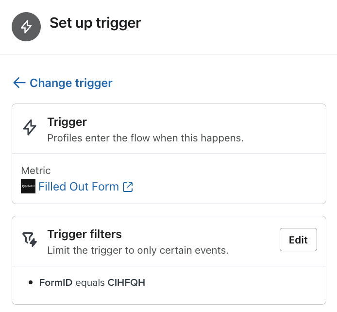Può utilizzare la metrica Modulo compilato di Typeform per attivare un flusso in Klaviyo. Per esempio, può attivare un flusso quando qualcuno compila un modulo specifico, utilizzando l'ID del modulo come filtro di attivazione. Nell'esempio seguente, il flusso viene attivato quando il cliente ha compilato il modulo con l'ID del modulo: CIHFHQ.