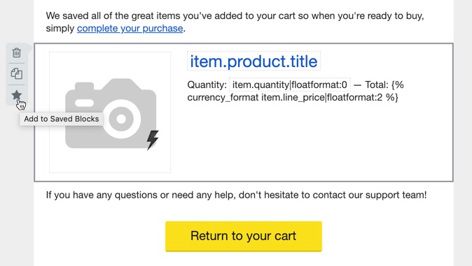 Come abbiamo già detto, la parte fondamentale del flusso di carrello abbandonato predefinito di Klaviyo, e che quindi deve essere mantenuta, è il contenuto dinamico. Per non rischiare di sovrascriverlo, ti consigliamo di salvare il blocco di contenuto dinamico e il pulsante prima di modificare il modello predefinito. Nel caso tu abbia già un template base progettato per le altre e-mail, utilizzalo come modello di carrello abbandonato e trascina il contenuto dinamico dalla libreria dei blocchi salvati.