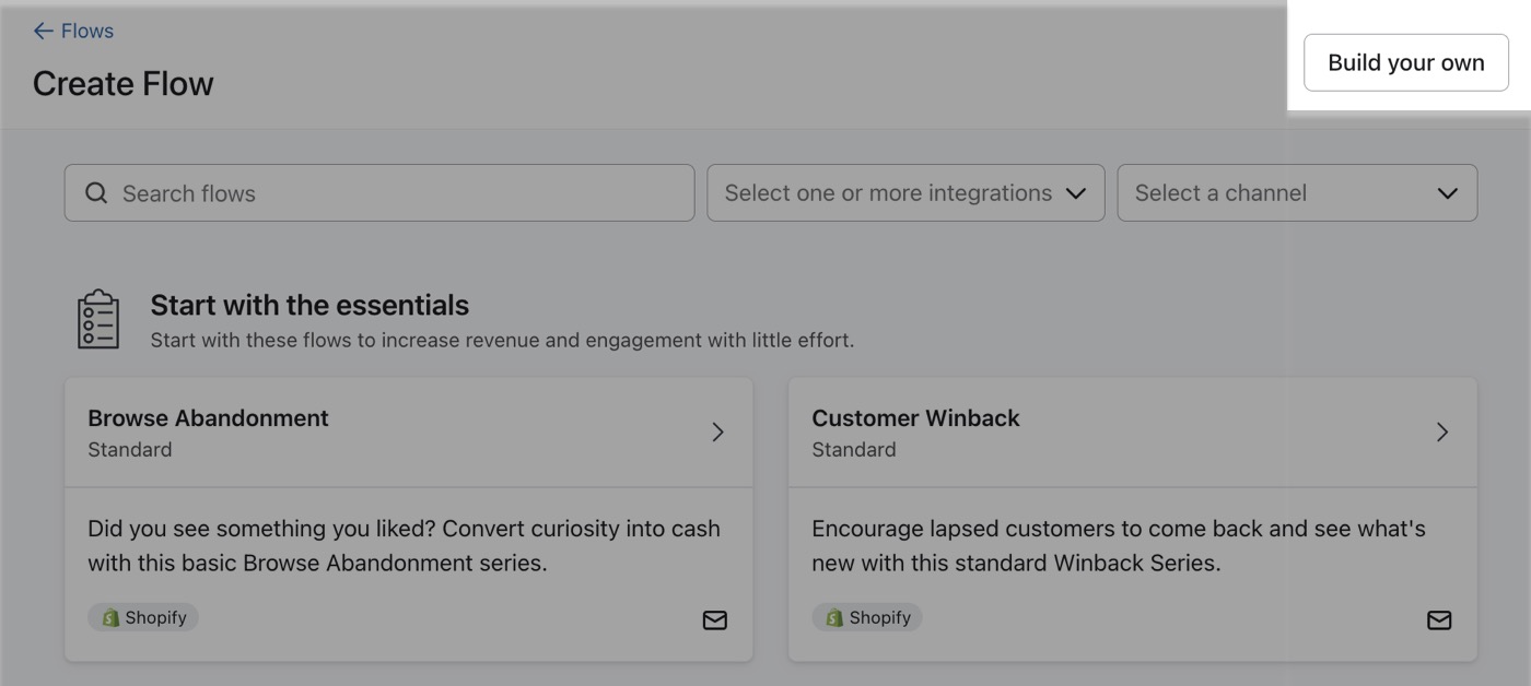 A seconda della tua integrazione, potresti vedere diversi tipi di flussi di carrello abbandonato che si adattano a diverse esigenze. Per iniziare, ti suggeriamo di scegliere uno di questi flussi predefiniti: potrai personalizzarlo a tuo piacimento in un secondo momento.