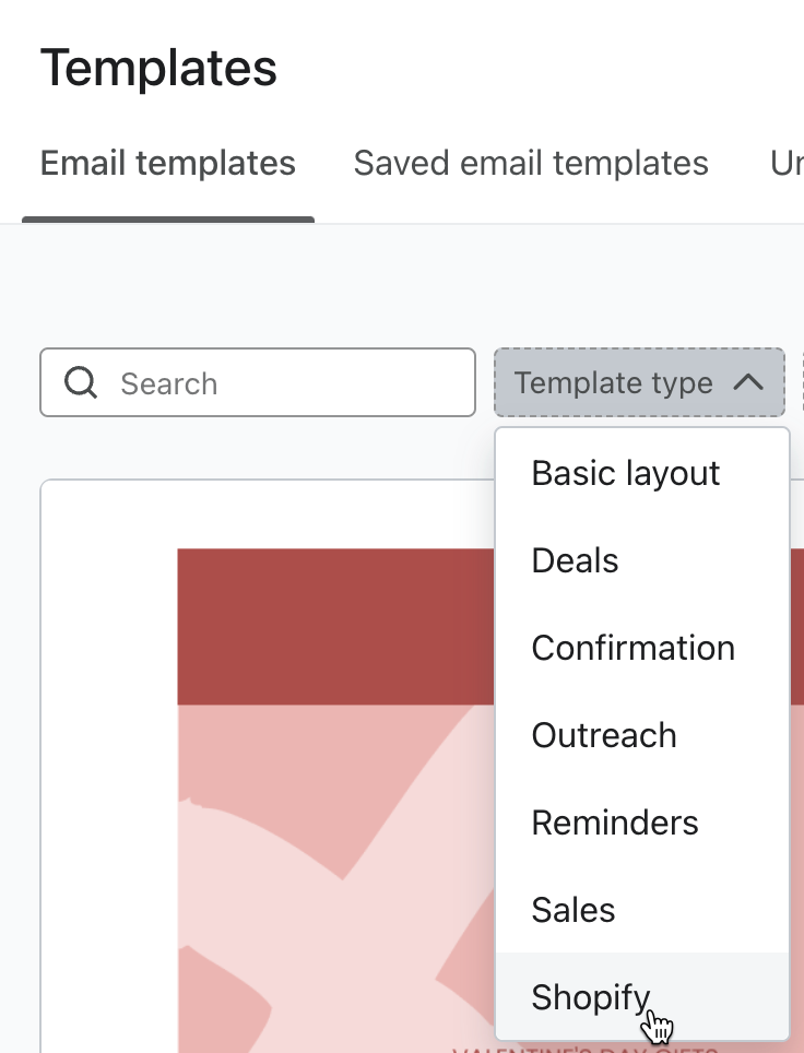 - Dalla scheda Modelli di e-mail, clicca sul menu a tendina Tipo di modello e seleziona Shopify.