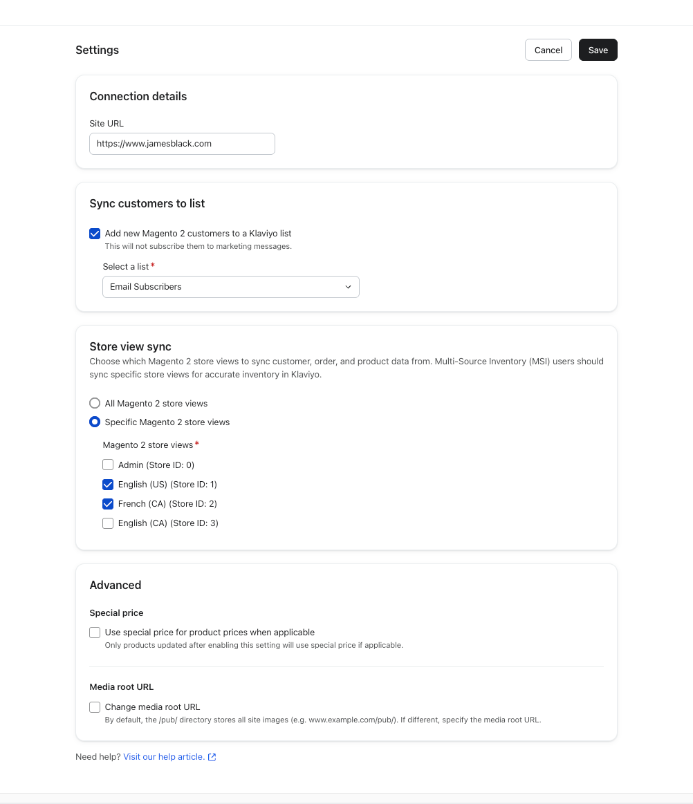 Questa impostazione sincronizzerà solo i nuovi clienti; i clienti esistenti devono essere migrati manualmente dal tuo elenco Magento a Klaviyo. - Quindi, seleziona le visualizzazioni del negozio da Magento 2 che desideri sincronizzare con Klaviyo. Tutte le visualizzazioni del negozio sono sincronizzate con Klaviyo per impostazione predefinita. Questa impostazione ti consente di scegliere con quali negozi effettuare l'integrazione. Se utilizzi Multi-Source Inventory (MSI) in Magento 2, controlla le visualizzazioni specifiche del negozio Magento 2 e seleziona i negozi che desideri sincronizzare per vedere il tuo inventario rappresentato correttamente in Klaviyo.