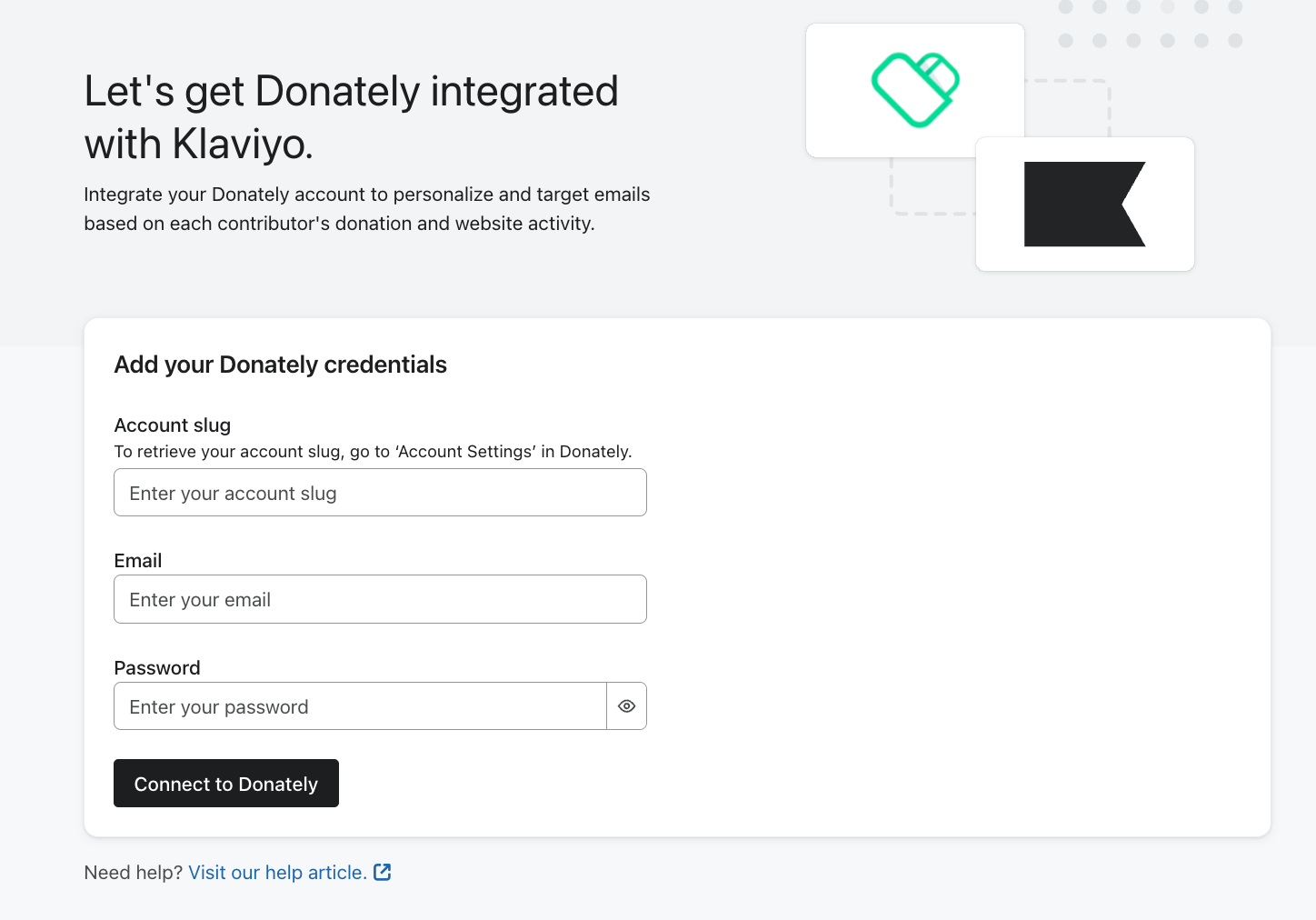 Per prima cosa, individuerà lo slug del suo account Donate.ly, quindi abiliterà l'integrazione in Klaviyo.