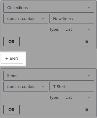 Supponiamo che lei imposti delle condizioni come nell'esempio seguente. Se l'ordine di una persona contiene la collezione "Articoli nuovi", allora non supera il primo filtro, ma se l'elenco degli articoli non contiene "T-Shirt," allora supera la seconda parte del filtro ed entra nel flusso. Per coprire entrambi gli scenari, è necessario collegarli con AND.