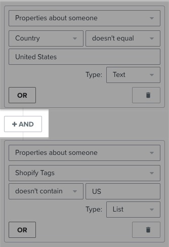 Se il Paese registrato di una persona è gli Stati Uniti, non supera il primo filtro. ma se i Tag di Shopify non contengono "US", allora passano la seconda parte del filtro ed entrano nel flusso. Per coprire entrambi gli scenari, è necessario collegarli con AND.