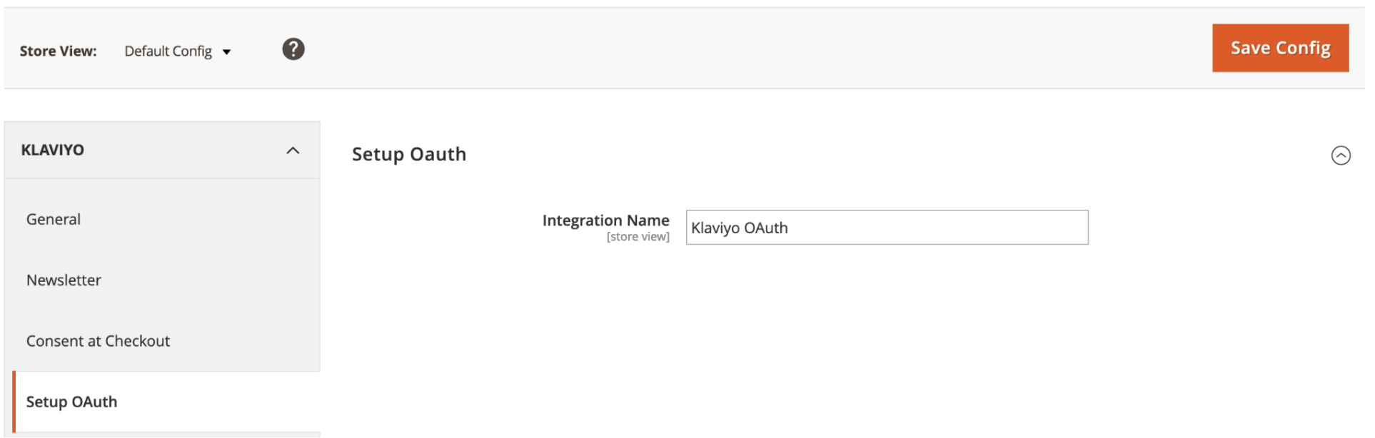 Si rechi su Stores > Configurazione dal cruscotto amministrativo. Clicchi su Klaviyo e selezioni la scheda Impostazione OAuth. Assegni alla sua integrazione un nome memorabile nel campo Nome; in seguito dovrà individuarla con questo nome. Clicchi su Salva configurazione per procedere.