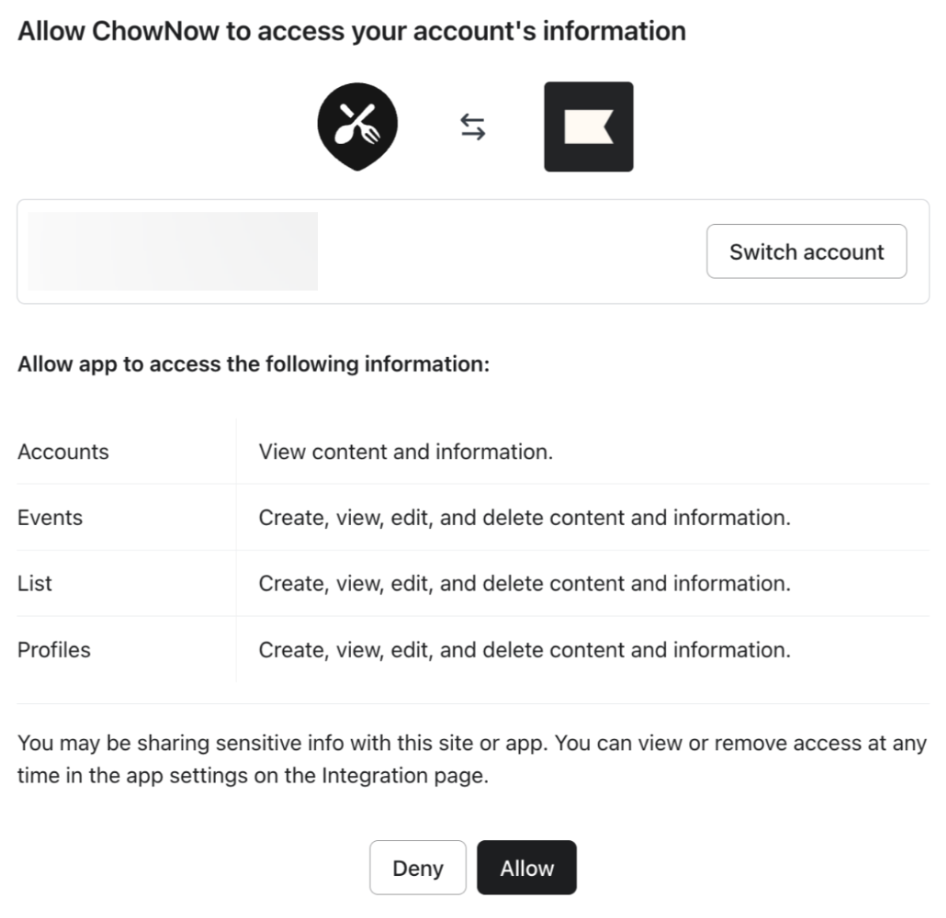 - Controlla le autorizzazioni in ChowNow e clicca su Autorizza. Verrai reindirizzato a Klaviyo e dovresti vedere un messaggio di successo.