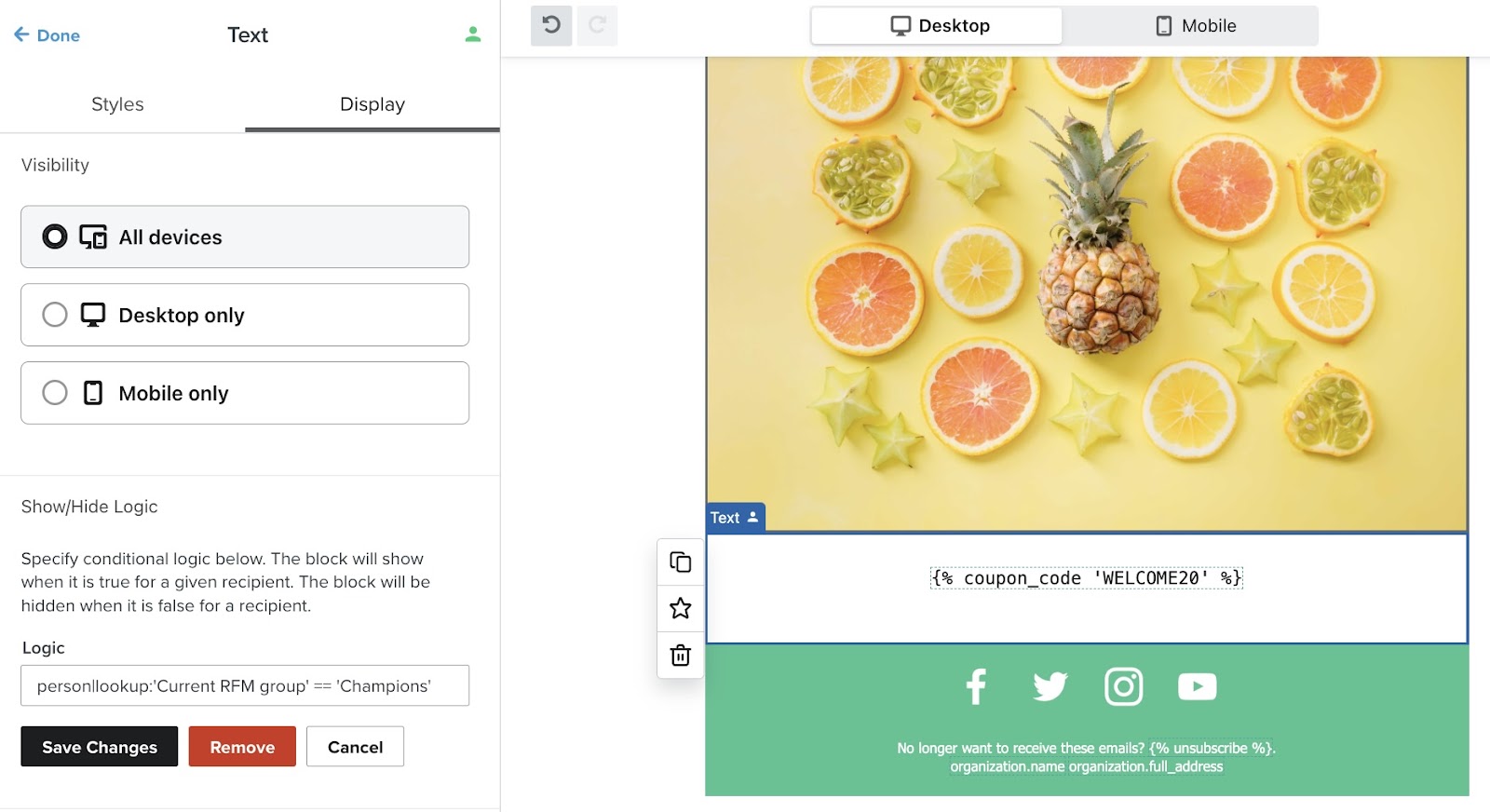 Puoi anche mostrare dinamicamente contenuti diversi nelle tue e-mail in base all'analisi del gruppo RFM di un profilo utilizzando la logica Klaviyo show/hide del modello. Questa funzionalità ti permette di personalizzare il contenuto della tua e-mail in base alle informazioni raccolte sul tuo iscritto, in modo che ogni destinatario abbia un'esperienza di marketing altamente pertinente.