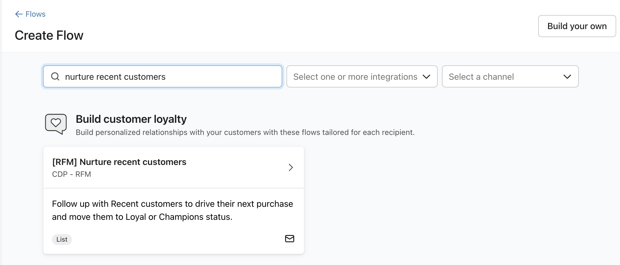 Puoi creare rapidamente un Flusso di nutrimento per Recent analisi RFM cliente utilizzando i Flussi precostituiti della libreria Flusso.