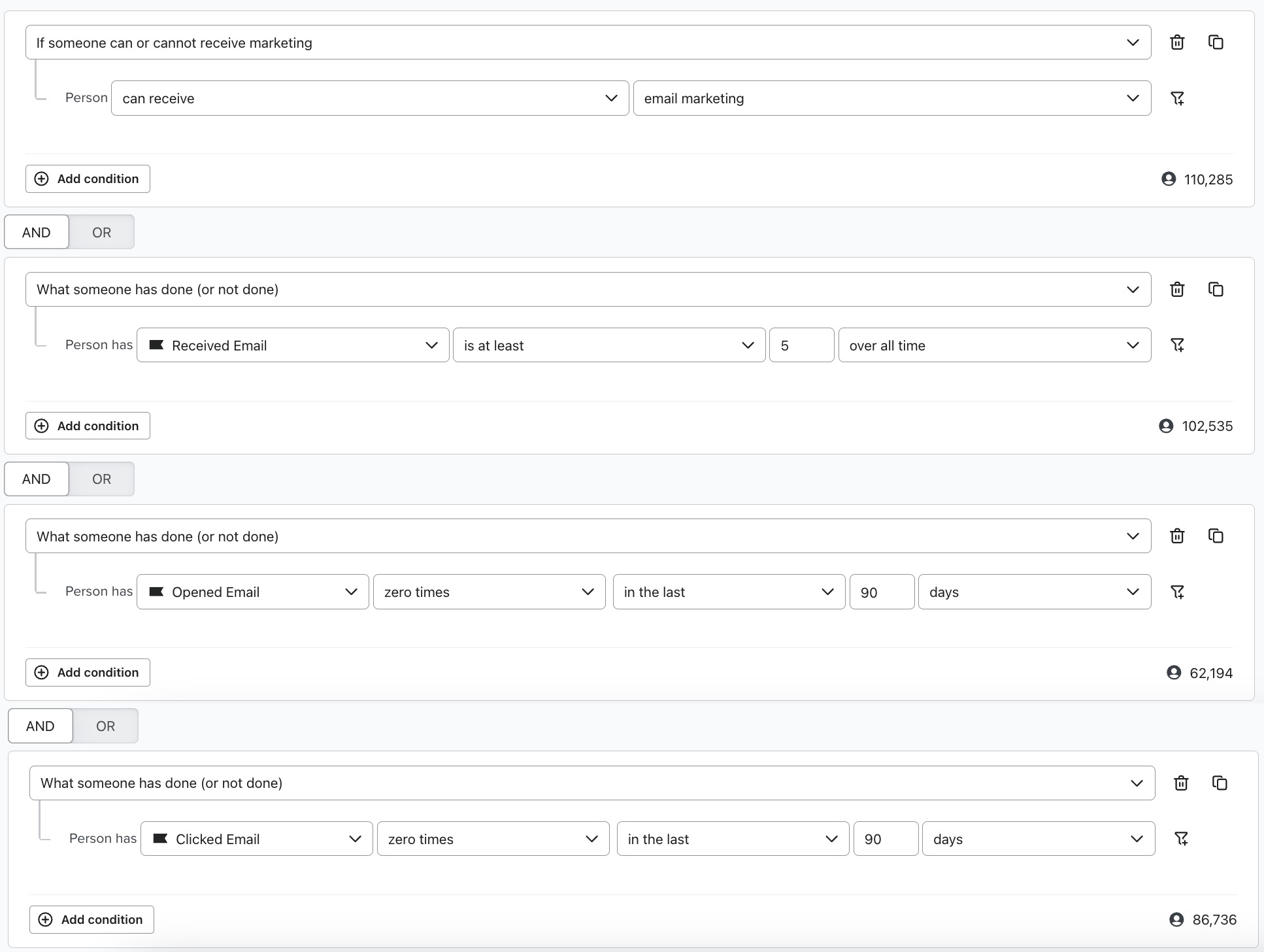 Puoi modificare la definizione per riflettere al meglio il tuo marchio e la frequenza con cui invii le e-mail; in questo esempio, il disimpegno è definito da un periodo di 90 giorni (3 mesi). Questo segmento identifica i contatti che hanno ricevuto e-mail, ma che non hanno aperto o cliccato per 90 giorni.