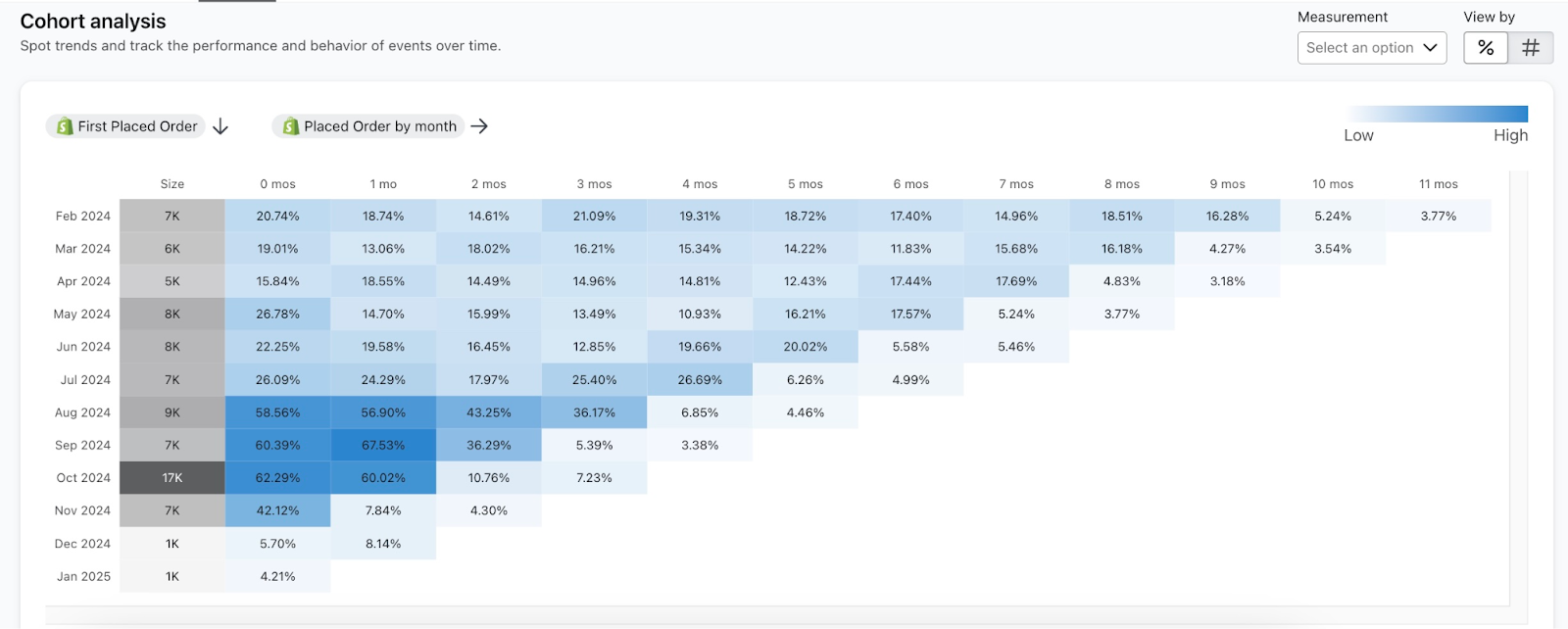 Nell'esempio, la prima colonna del report della coorte (cioè Dimensione) mostra il numero totale di clienti che hanno effettuato un primo acquisto nel 2024. Ogni colonna successiva mostra la percentuale della coorte originale che ha effettuato ulteriori acquisti nel corso del tempo per ogni mese solare. Leggendo il report in orizzontale, otterrai approfondimenti sul tasso di acquisto ripetuto nel tempo.