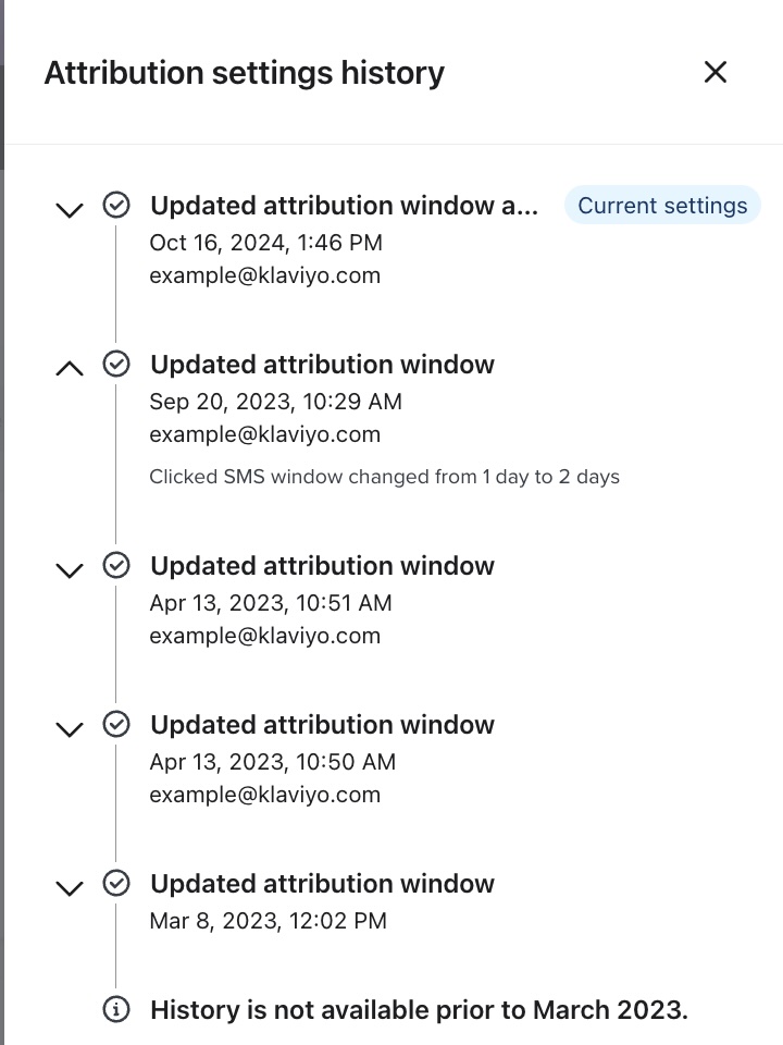 Scopri come utilizzare la cronologia delle impostazioni di attribuzione di Klaviyo per vedere la cronologia delle modifiche apportate alle tue impostazioni di attribuzione. Questo ti permette di capire quali modifiche sono state apportate alle impostazioni di attribuzione del tuo account, quando sono avvenute e chi ha effettuato la modifica.