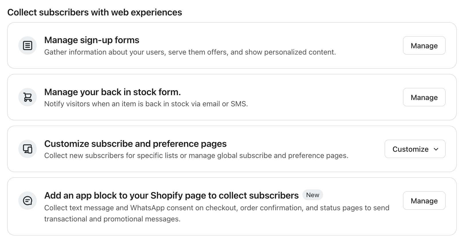 - Accanto ad Aggiungi un'app alla tua pagina Shopify per raccogliere gli iscritti, seleziona Configura.