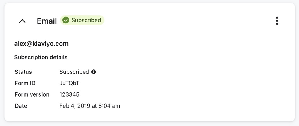 Quando gli iscritti inviano il loro consenso attraverso un modulo, Klaviyo memorizza diverse proprietà chiave personalizzate sul loro profilo: