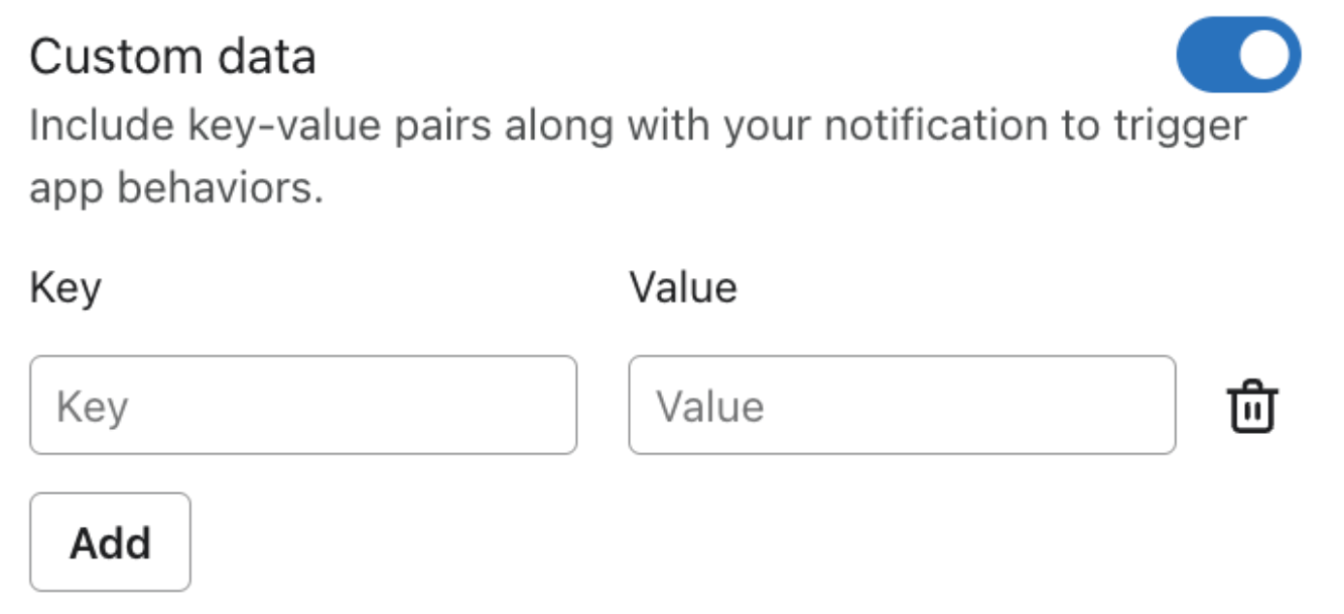 - Nella sezione Dati personalizzati, puoi includere coppie di valori-chiave insieme alla notifica per attivare i comportamenti dell'applicazione da parte delle notifiche standard e silenziose push. Puoi aggiungere fino a 10 coppie chiave-valore per ogni push. Scopri di più sulle coppie chiave-valore.