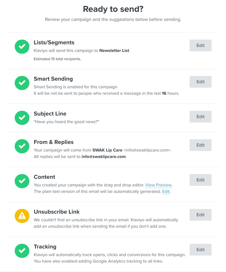 Se utilizza un modello Klaviyo, includeremo questi link per lei. Se non è sicuro di aver incluso un messaggio di annullamento dell'iscrizione, nella pagina di revisione della campagna sarà presente una notifica che indica se è presente o meno un link di annullamento dell'iscrizione.