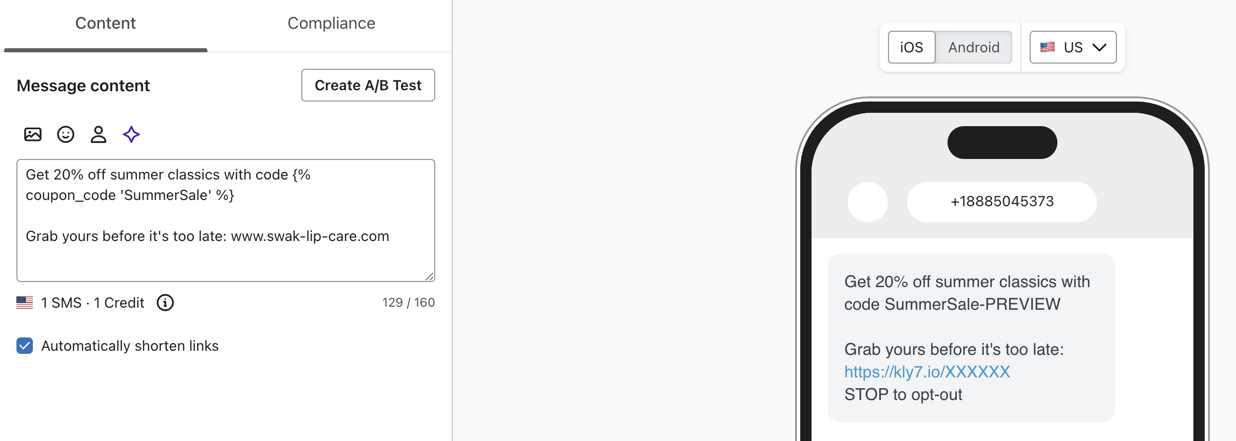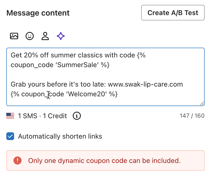 Una volta generati o caricati i coupon su Klaviyo, può iniziare a includere i coupon nelle campagne SMS o MMS inviate ai suoi abbonati. È possibile aggiungere solo 1 codice coupon a un singolo messaggio SMS.
